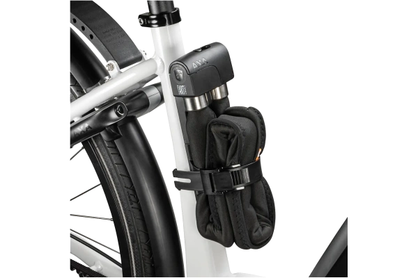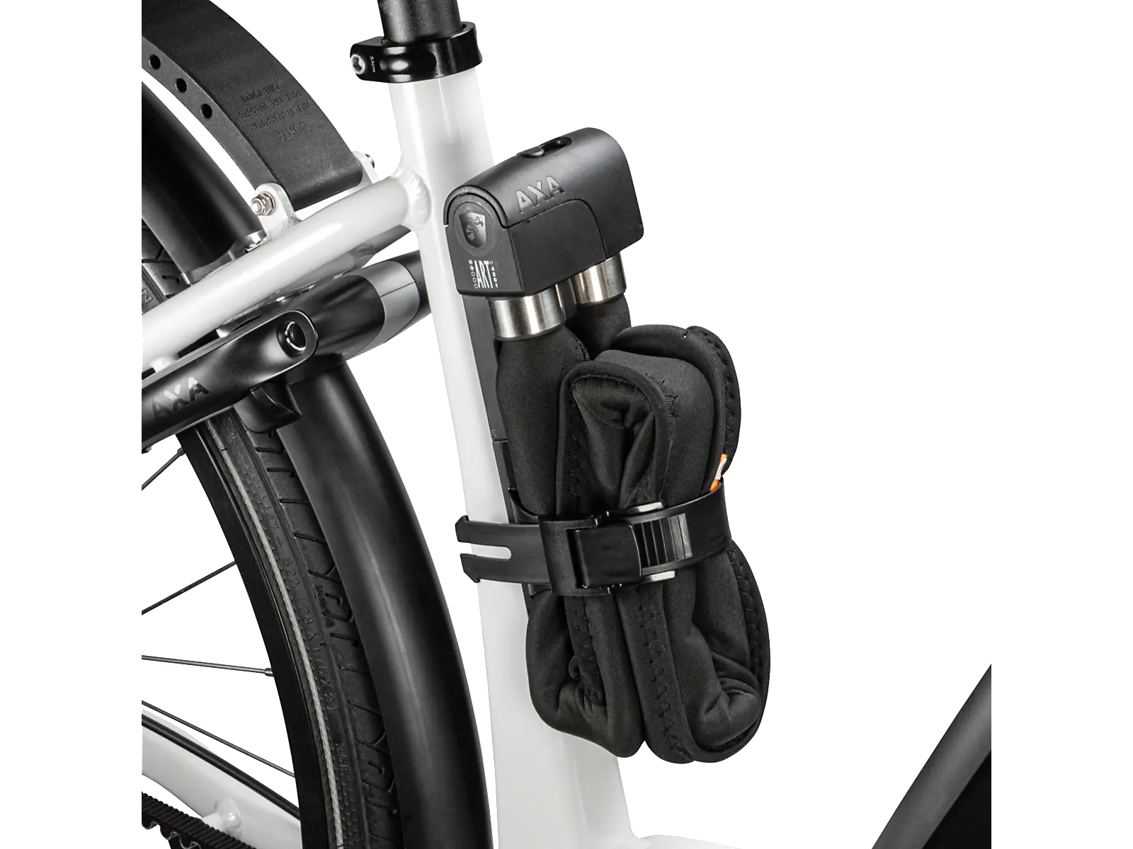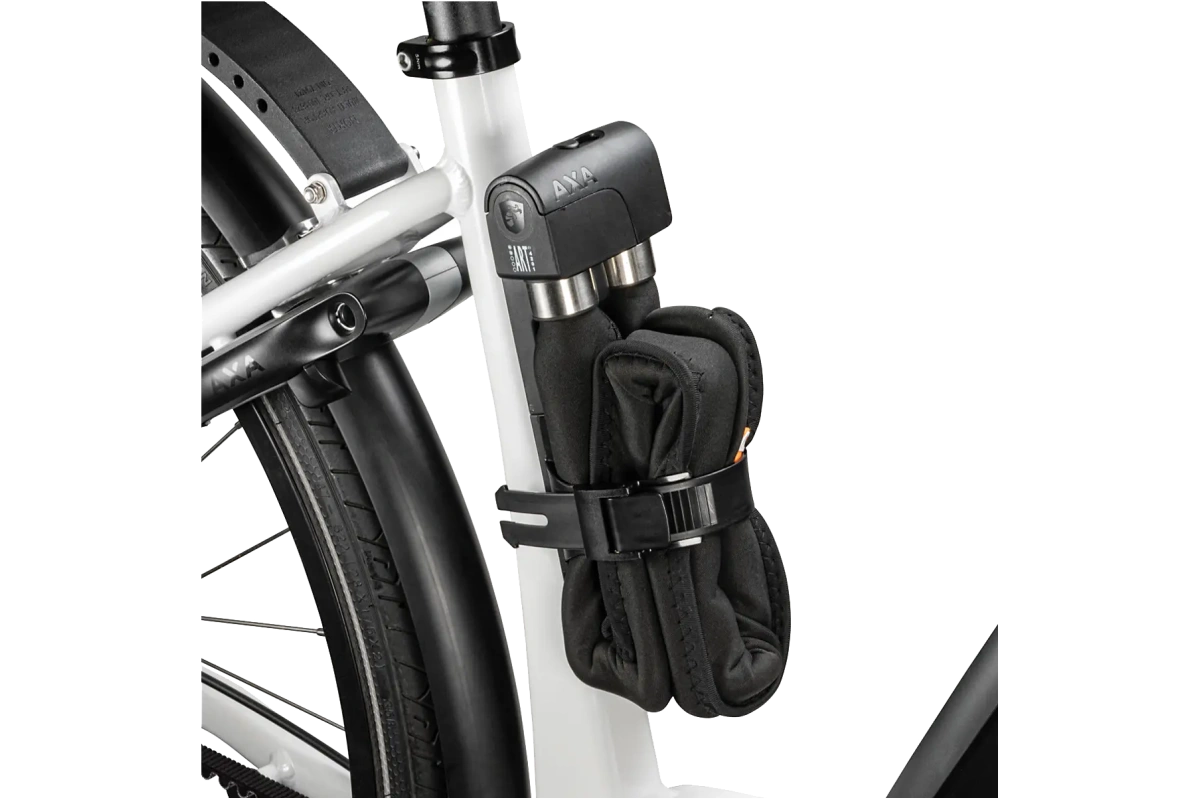 Mukana tuleva neopreenisuojus suojaa pyörän runkoa naarmuilta, ja lukon sylinteri on suojattu kosteudelta ja lialta pitkän käyttöiän varmistamiseksi. Lukko toimitetaan tukevassa, kolinattomassa kotelossa, joka voidaan kiinnittää pyörän runkoon – mukana tulee AXA Fix -asennussarja, jos pyörässä ei ole valmiita kiinnityspisteitä.