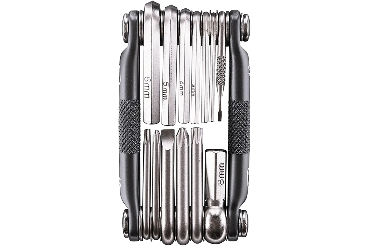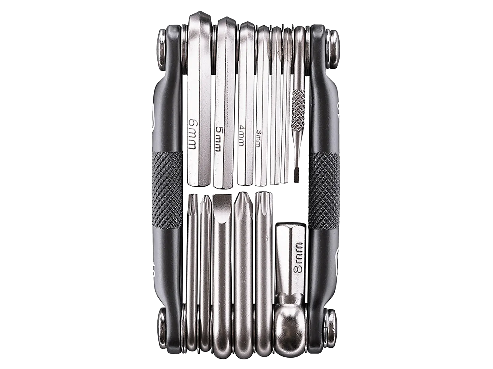 Mukana tulee laaja valikoima perustyökaluja, kuten kuusiokoloavaimet (2–8 mm), Torx-avain (T10, T25), ruuvimeisselit (risti ja ura), sekä pinnavääntimet (0, 1, 2). Tämä tekee M13:sta luotettavan kumppanin kaikenlaisiin huoltotoimiin kesken ajon.