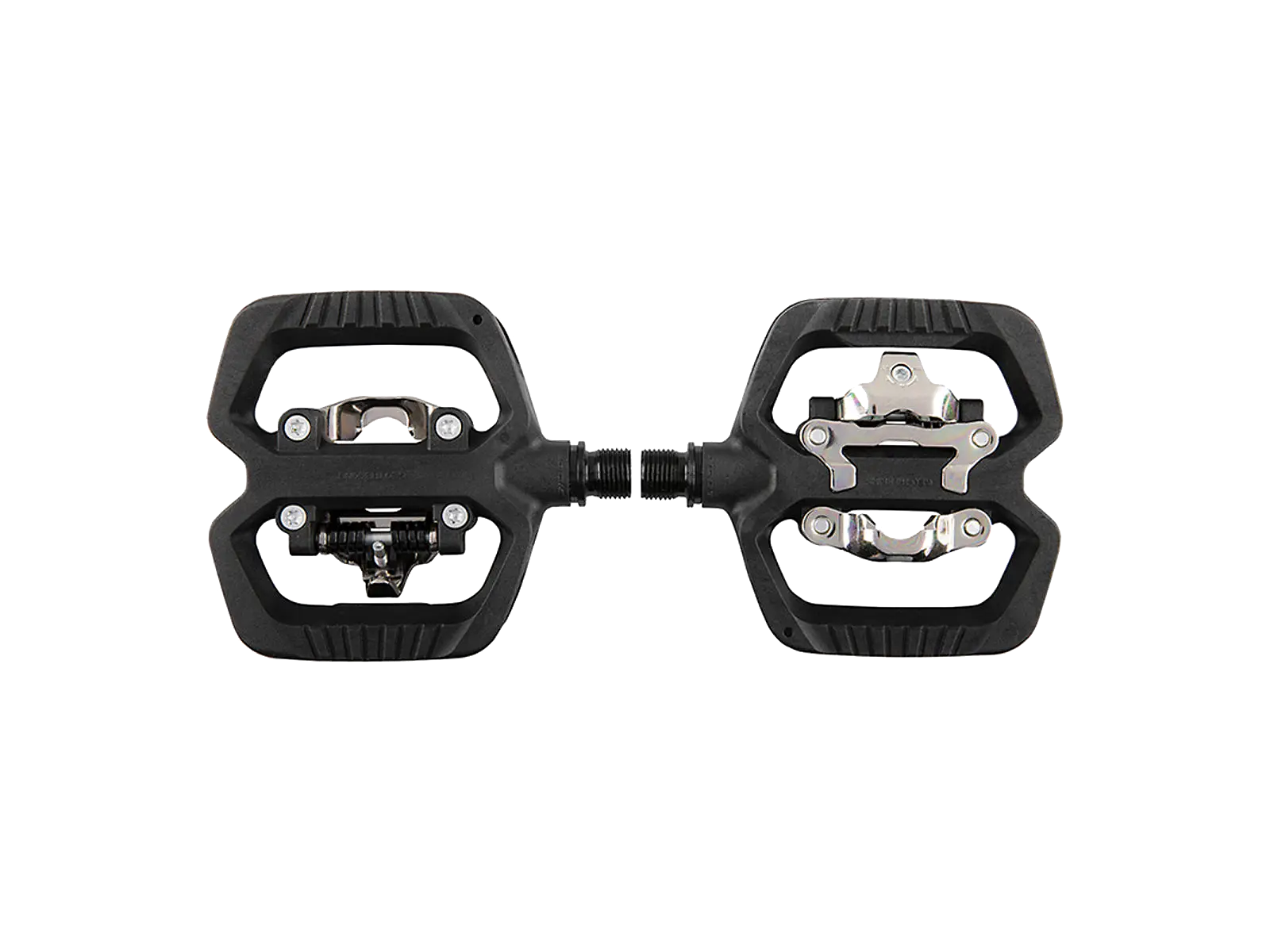 Polkimen komposiittirunko on kevyt mutta kestävä, ja siinä olevat integroidut komposiittinastat parantavat pitoa avopuolella. Lukkopuolella SPD-klossiyhteensopivuus varmistaa turvallisen ja tehokkaan poljinliikkeen pidemmillä matkoilla tai kovemmassa ajossa.