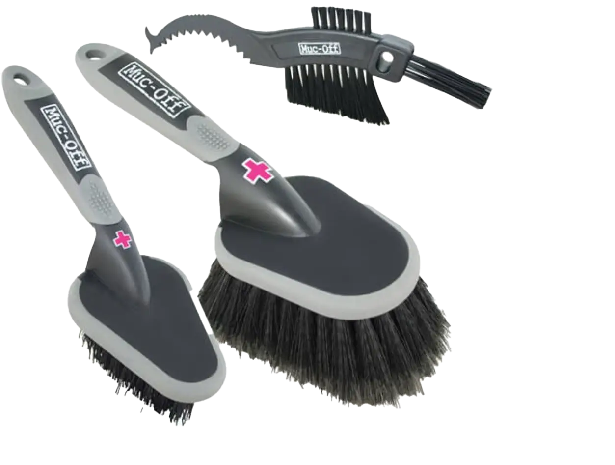 Muc-Off 3x Brush Set on helppo käyttää: kastele harjan harjakset vedellä ja lisää sitten Muc-Off Bike Cleaner -puhdistusainetta. Levitä puhdistusainetta pyörän eri osiin harjojen avulla ja huuhtele sitten vedellä. Harjojen pitkät varret ja ergonominen muotoilu tekevät puhdistamisesta helpompaa ja mukavampaa.