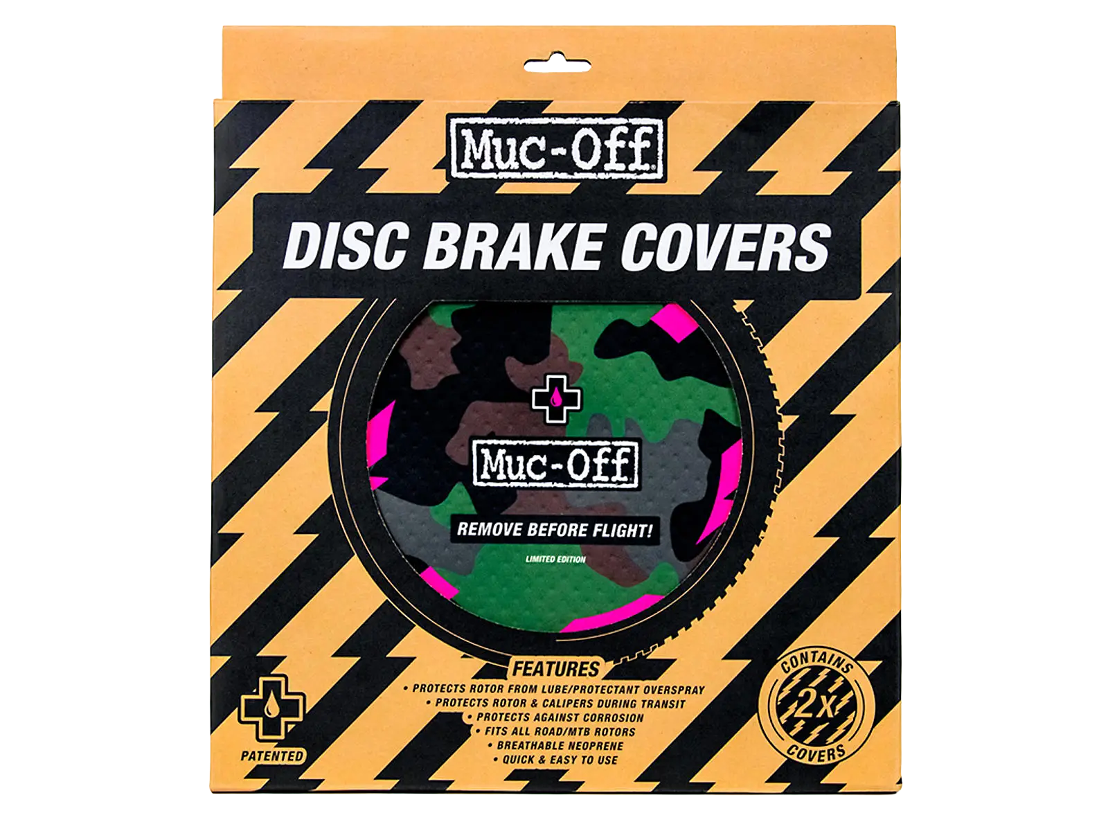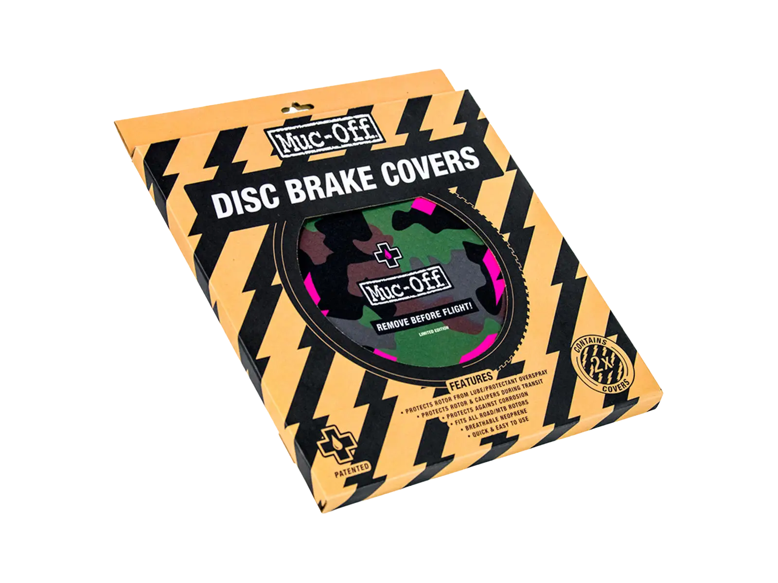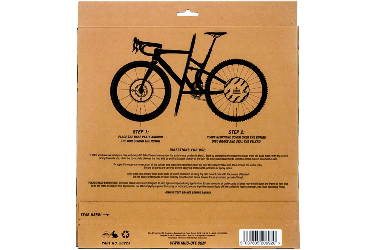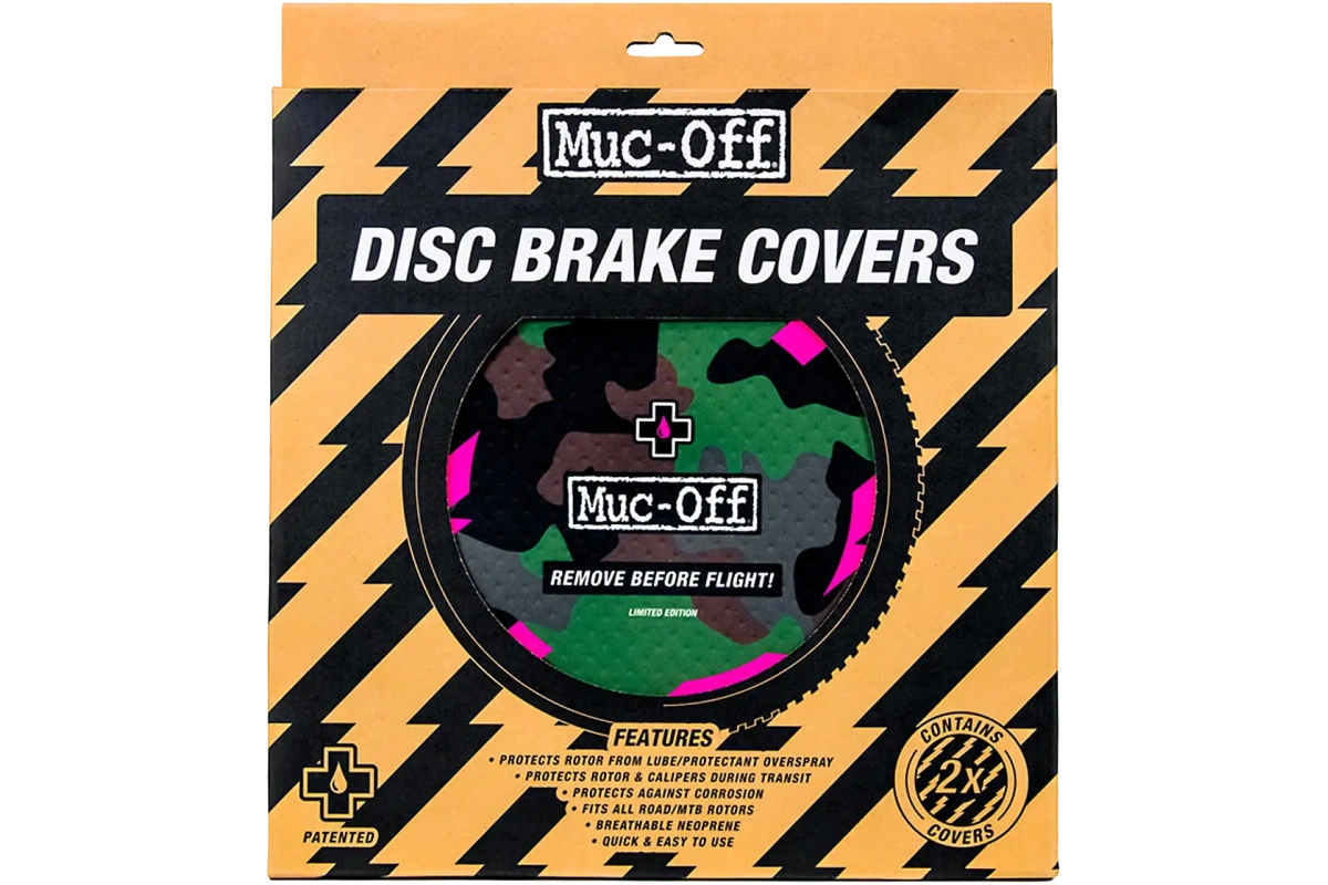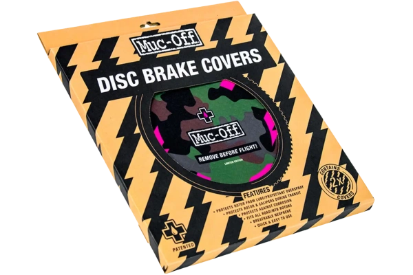 MUC-OFF Disc Brake Covers CAMO -levyjarrusuojat on suunniteltu suojaamaan jarrulevyjä ja -satuloita voiteluaineiden, puhdistusaineiden tai suoja-aineiden ylipurskeilta huollon ja pesun aikana. Näiden suojusten ansiosta voit huoltaa ketjut, rungon tai kiekot ilman, että levyjarrujen teho vaarantuu.