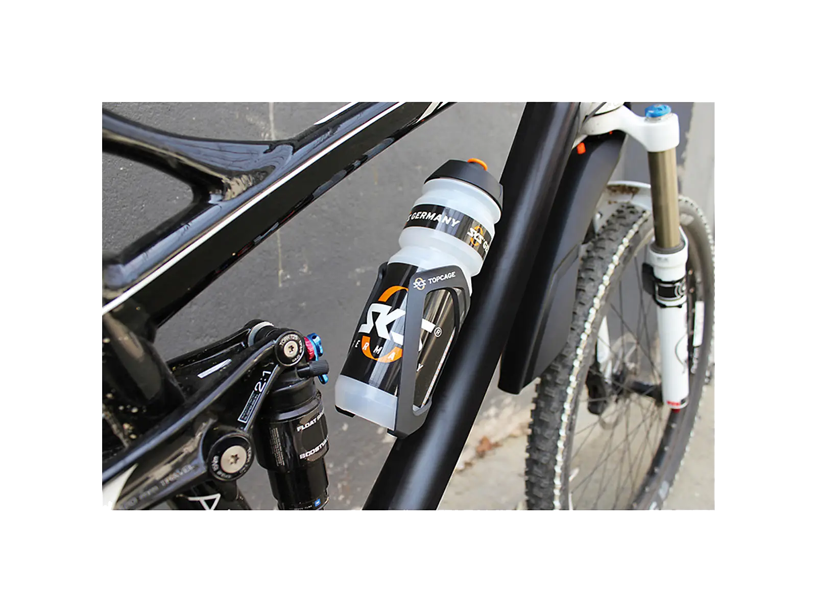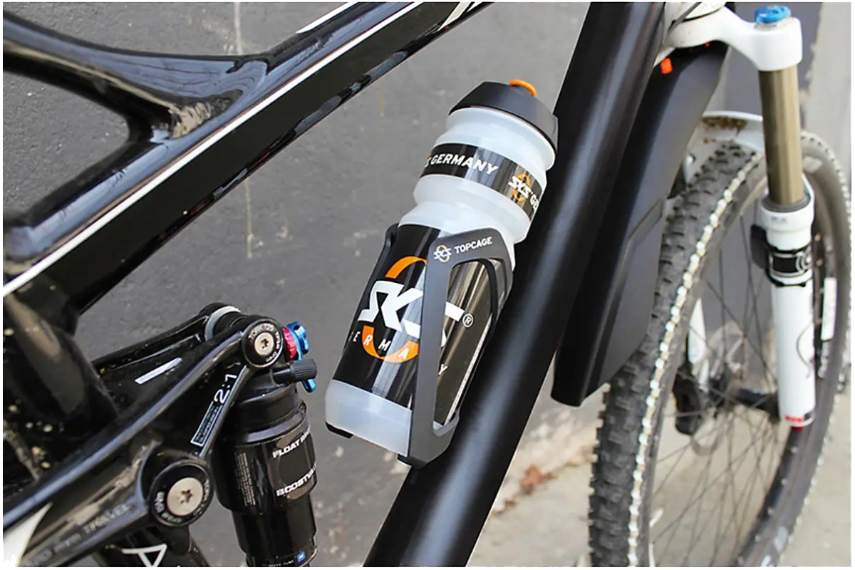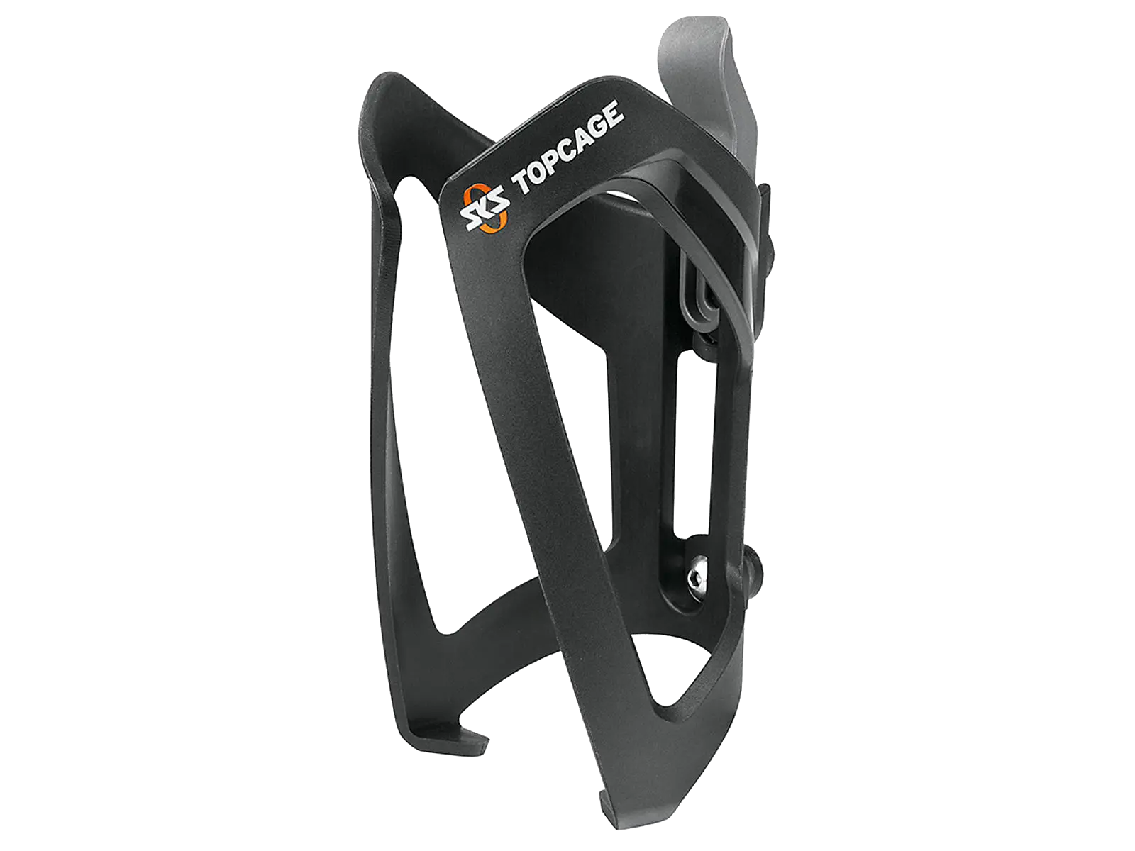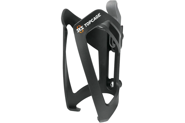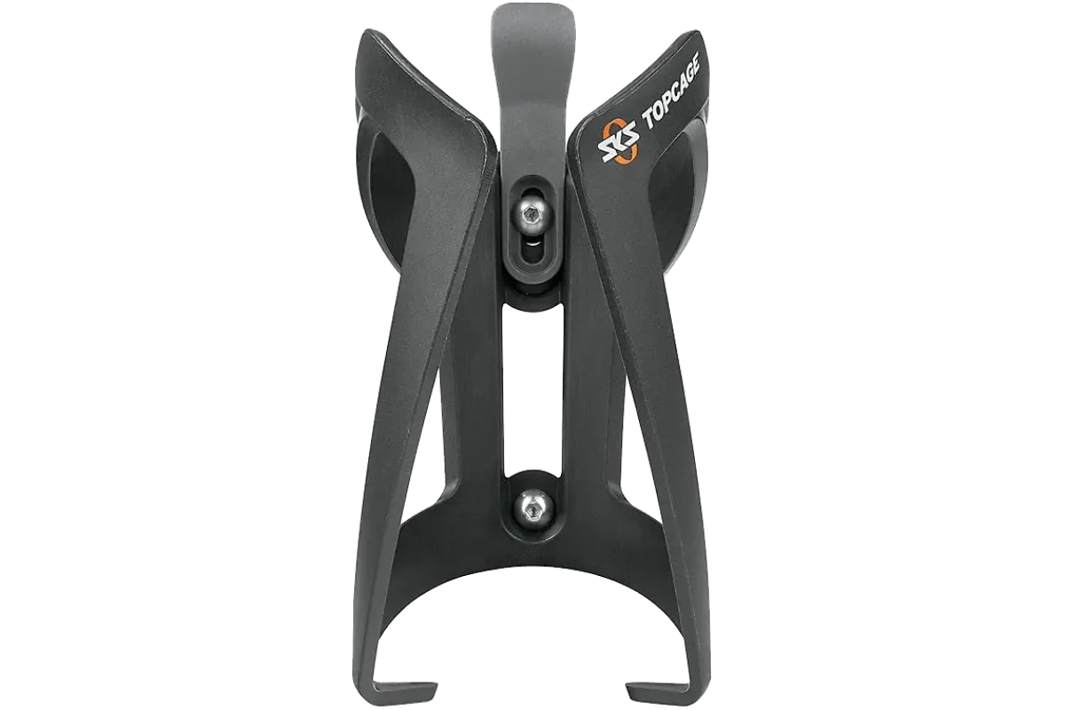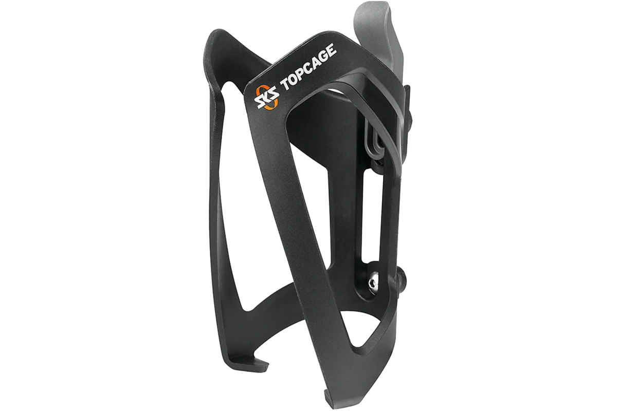 SKS Topcage on kestävästä nylonista valmistettu pulloteline, jossa on etusuuntainen pullonsyöttö ja säädettävä rakenne kaikenkokoisille juomapulloille. Kevyt (53 g), musta runko ja valkoinen SKS-logo.