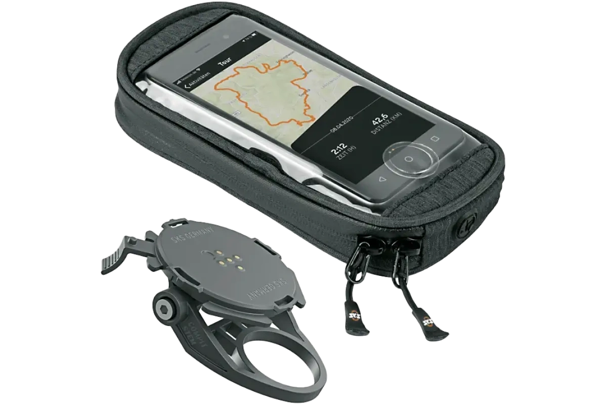 Vesitiivis COM/SMARTBAG-universaali matkapuhelinkotelo (sopii kaikkiin yleisiin älypuhelimiin) voidaan kiinnittää telineeseen yhdellä kiertyksellä. Erikoista COMPIT-koteloa ei siis tarvita. Läpinäkyvä ikkuna mahdollistaa kosketusnäytön kätevän käytön. Lisätasku tarjoaa paitsi lisätilaa avaimille ja rahalle, myös tilan COM/UNIT-varavirtalähteelle, joka mahdollistaa matkapuhelimen induktiivisen lataamisen pyöräillessä.