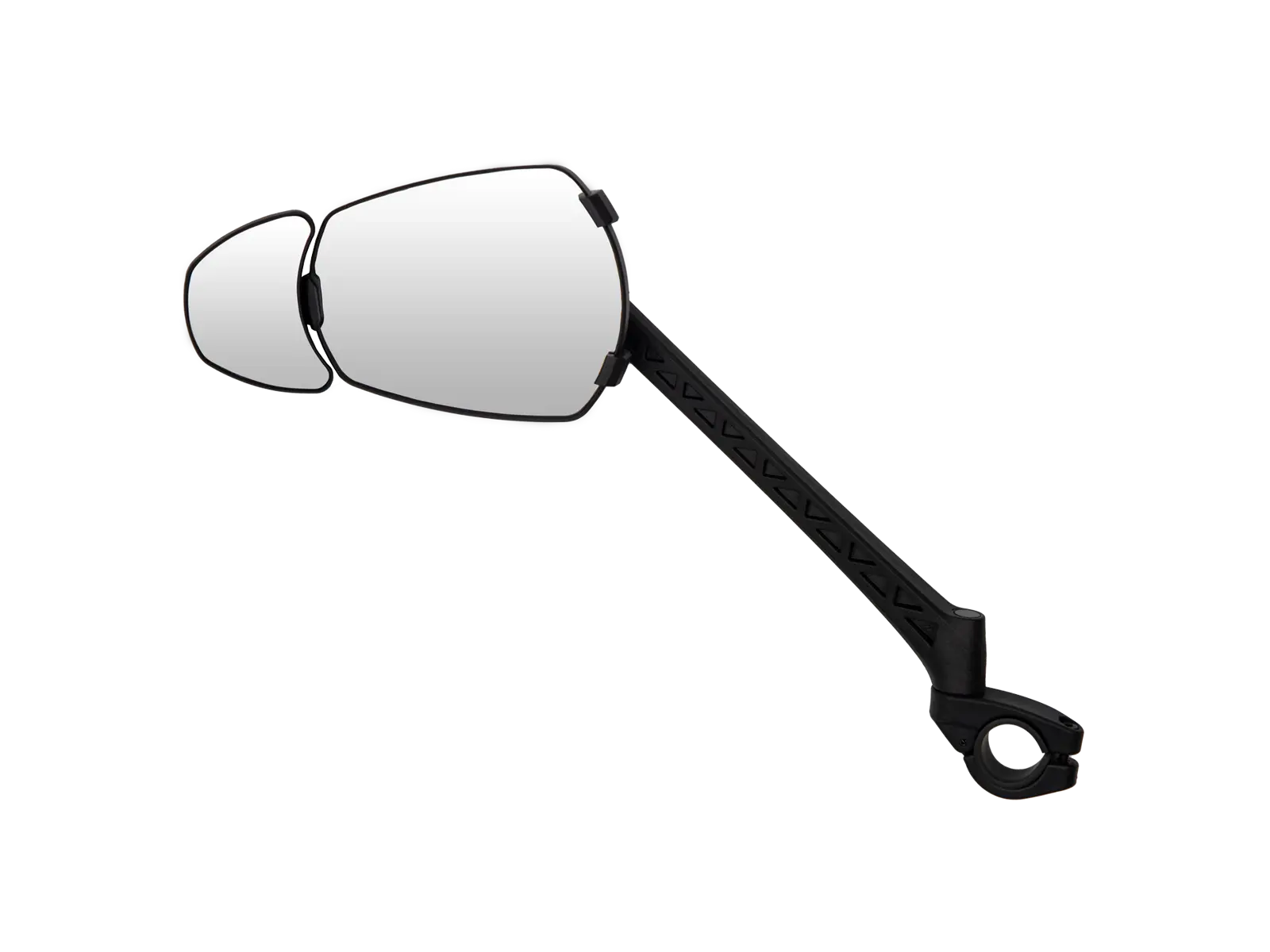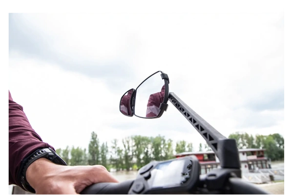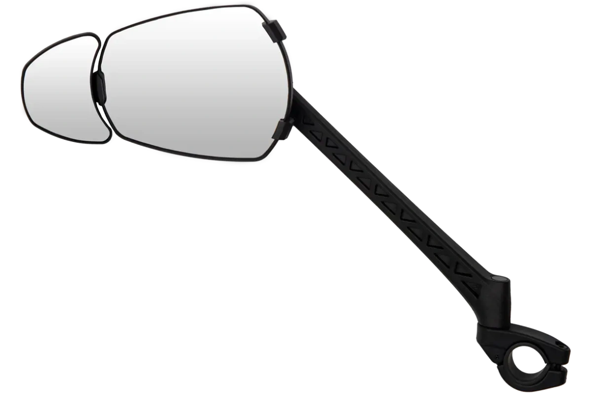 Erittäin suuri pääpeili ja lisäksi varustettu pienemmällä lisäpeilillä, joka antaa laajemman katsantokentän suoraan pyörän takana kulkeviin kohteisiin. Näin voit helposti havaita niin autoilijat, jalankulkijat kuin muut pyöräilijät ajoissa ja reagoida turvallisesti.