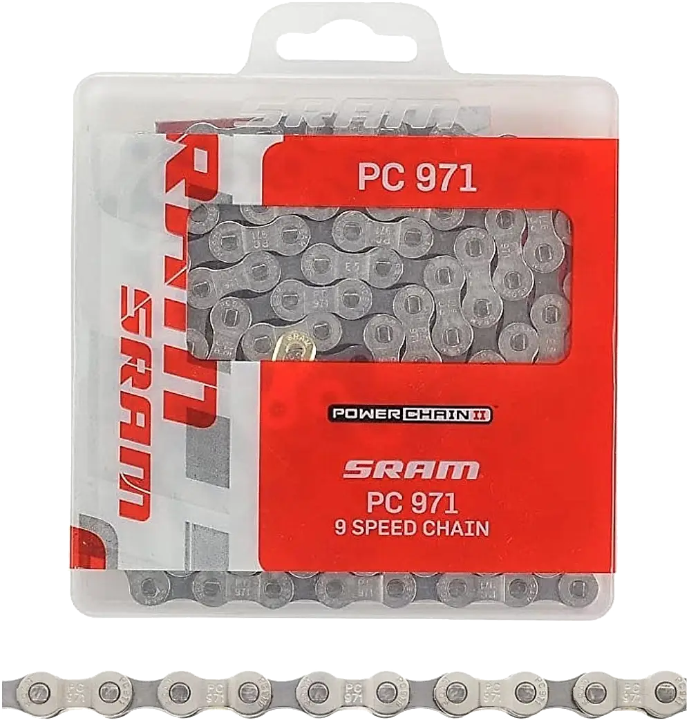 SRAM PC-971 on kestävä 9-vaihteinen ketju, jossa on Step 2 -muotoilu ja Chrome Hardened -kovetetut tapit. Tarjoaa sulavan vaihteensiirron ja pitkän käyttöiän maasto- ja maantiepyöräilyssä.